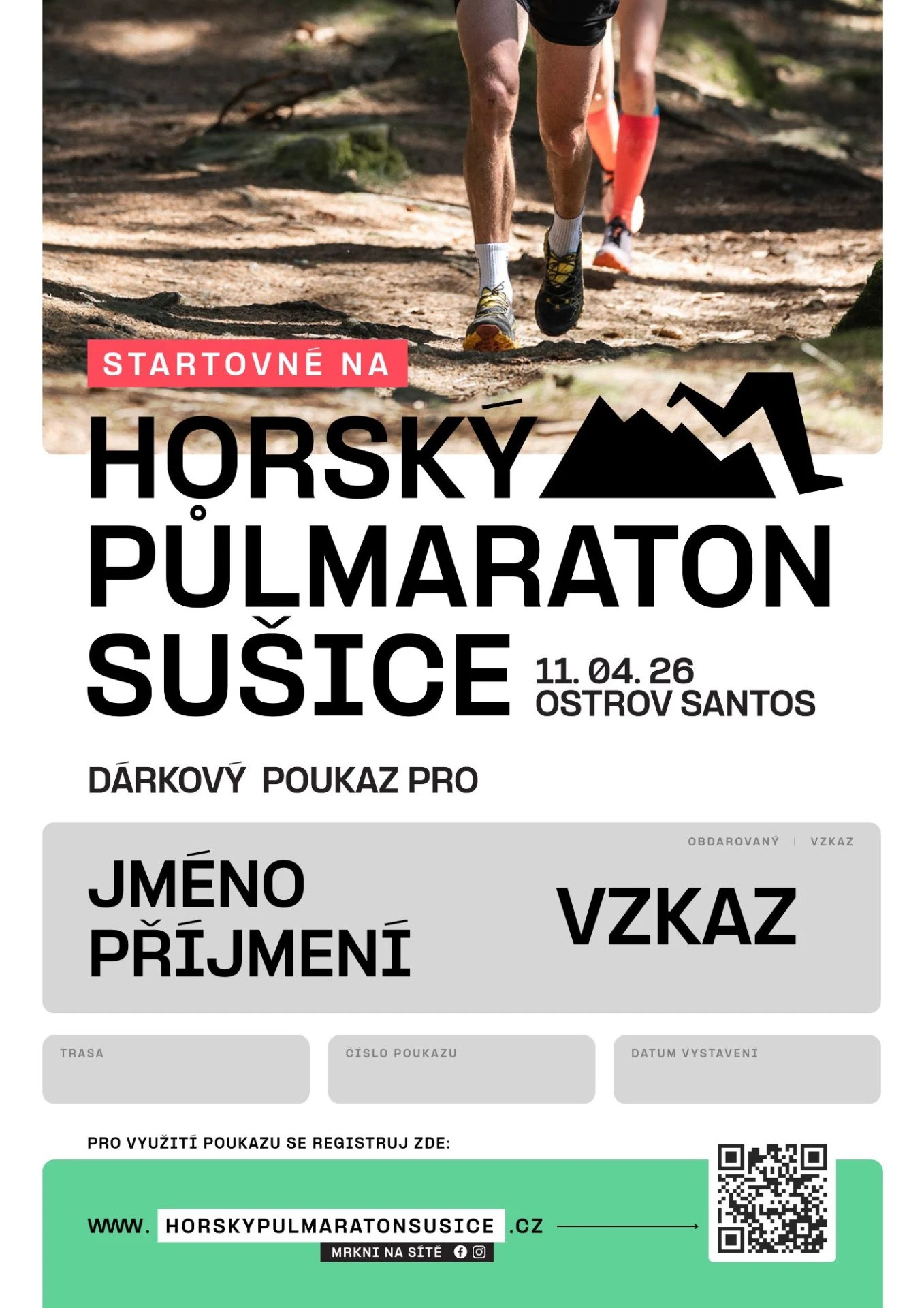 Chcete potěšit své blízké originálním dárkem? Máme pro vás skvělou příležitost! Zakupte dárkový poukaz na Horský půlmaraton Sušice a darujte svým přátelům či rodině jedinečný zážitek v podobě účasti na našem závodě. Cena poukazu je ... Kč.
