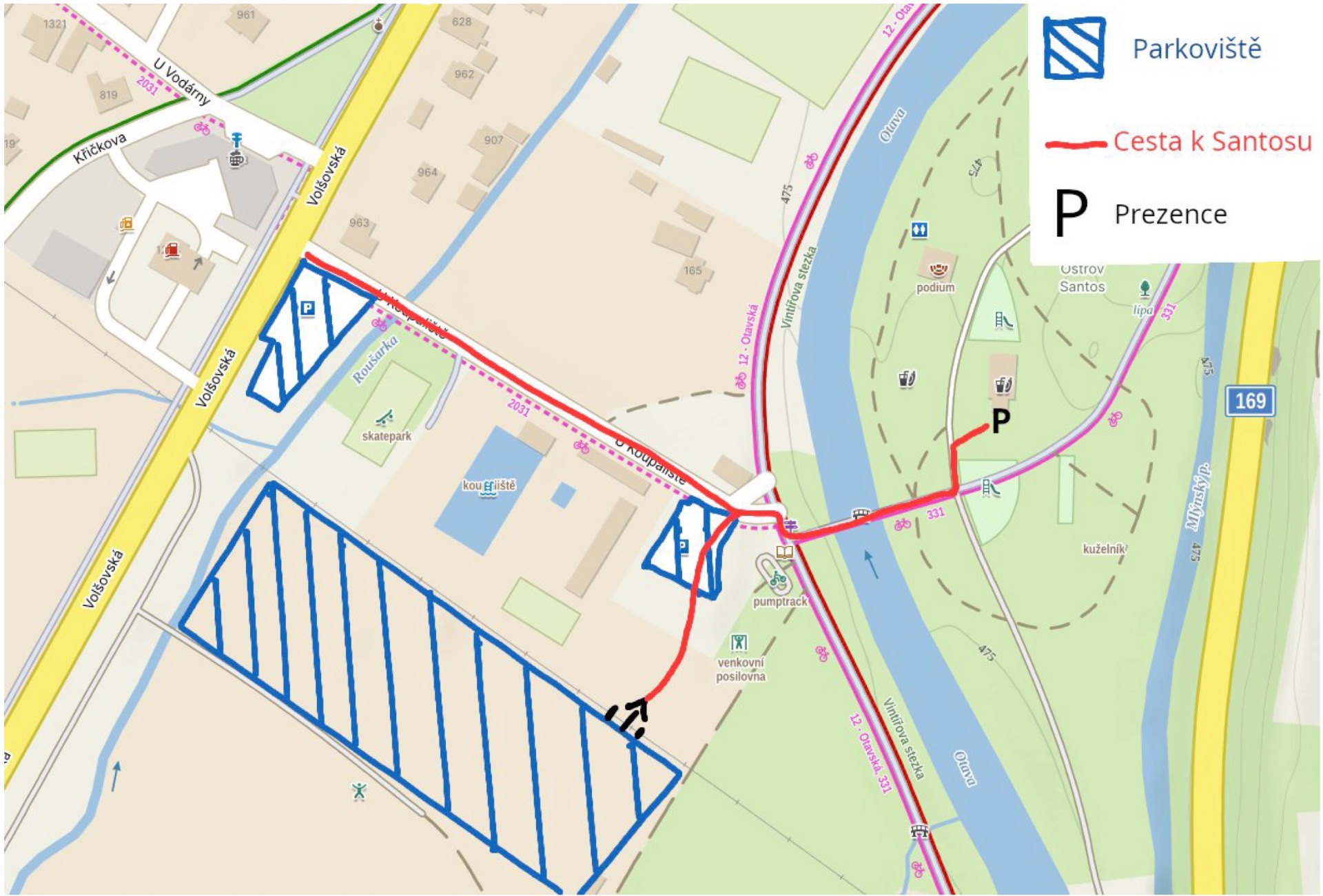 Parkování: dle mapy ve Volšovské ulici u skateparku, mezi koupalištěm a ostrovem, za koupalištěm,